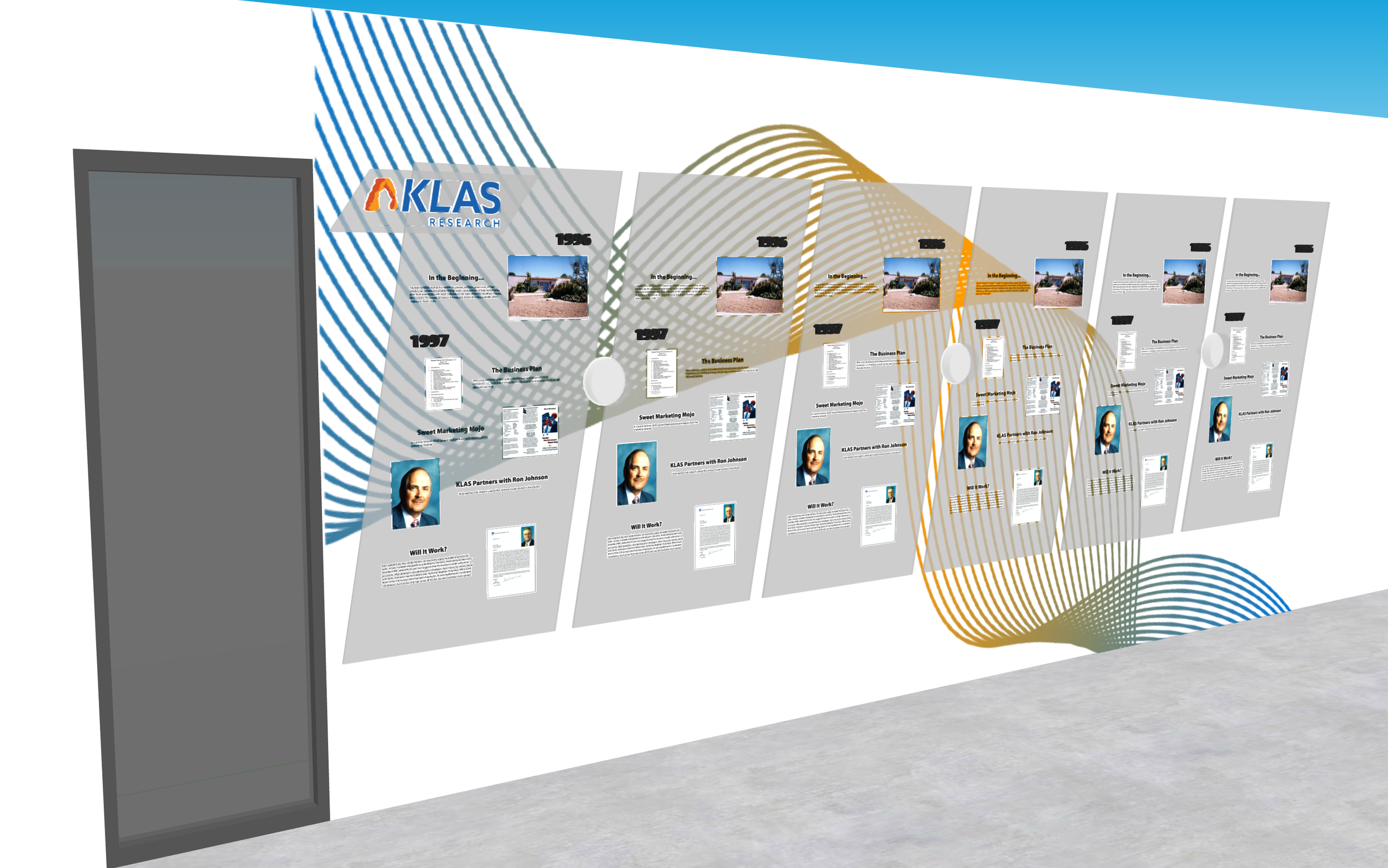 While working as a print shop manager and graphic designer, I collaborated with KLAS Research to create a unique timeline display for a large hallway in their corporate office. The goal was to showcase key milestones and highlights of the company’s history.