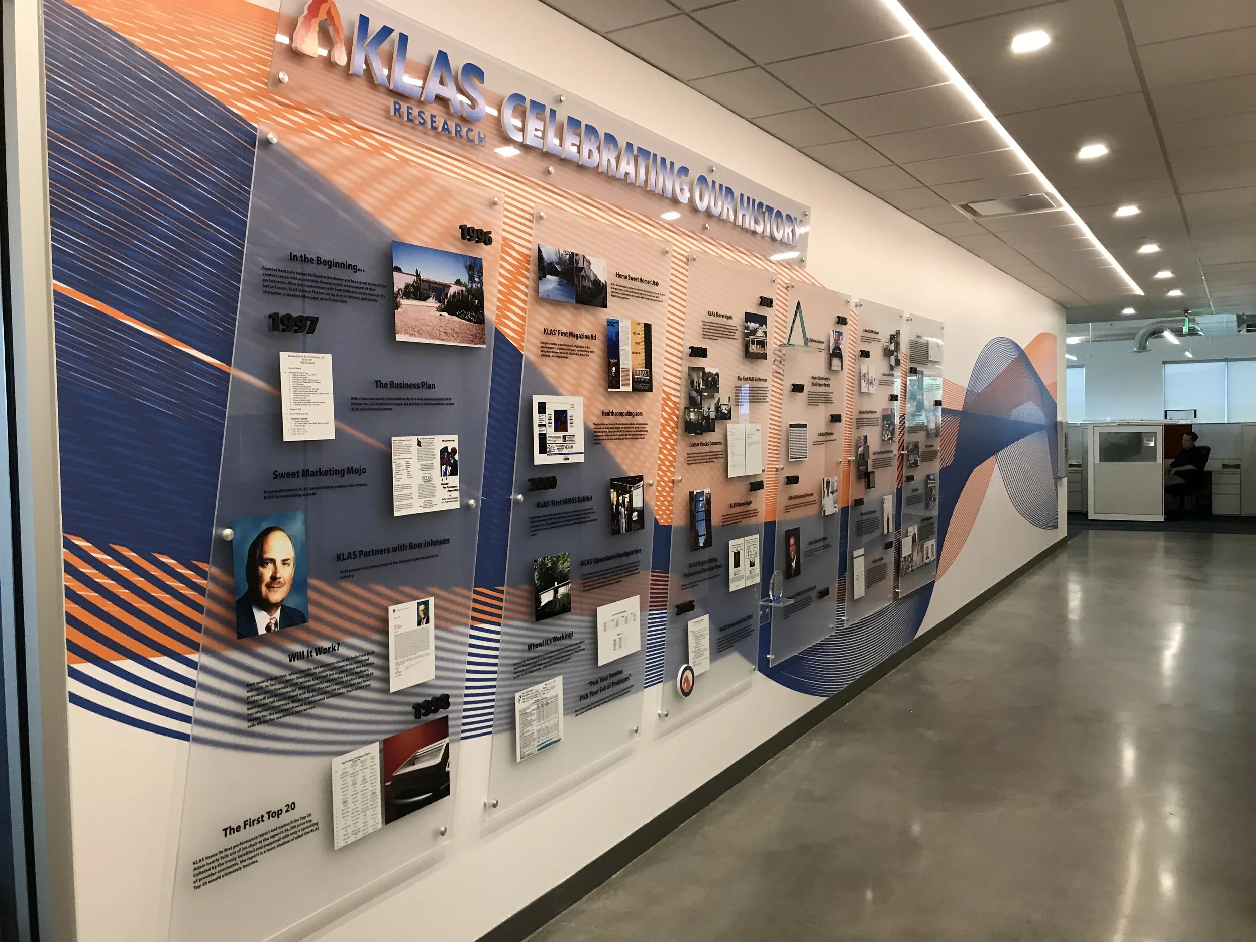 After conducting a site visit and reviewing the client’s timeline materials—mostly newspaper clippings and small images—I designed a dynamic timeline wall. The design featured a bold backdrop, with large angled acrylic pieces attached to the wall, each displaying different chunks of the company’s history. I handled everything from the design to production and installation, delivering a visually impactful display that celebrates KLAS Research's journey.